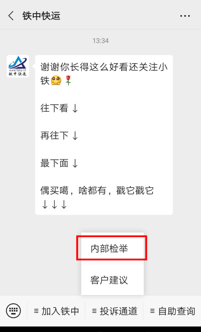 铁中快运官方公众号首页菜单--投诉通道--内部检举!